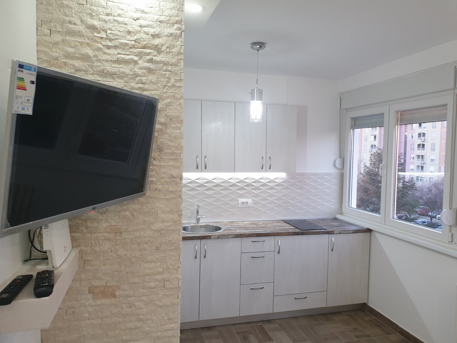 Sastoji se od dnevne sobe sa trpezarijom + jedna spavaća soba, kupatilo i hodnik. Stan je kompletno renoviran i opremljen novim stvarima.