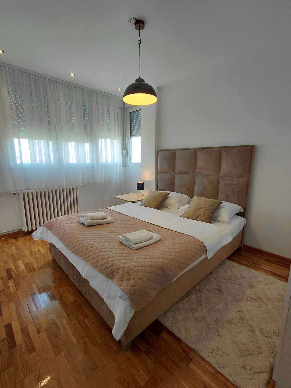 Odvojena spavaća soba opremljena je velikim bračnim krevetom, kvalitetnom posteljinom i ormanom, što garantuje miran i udoban san.