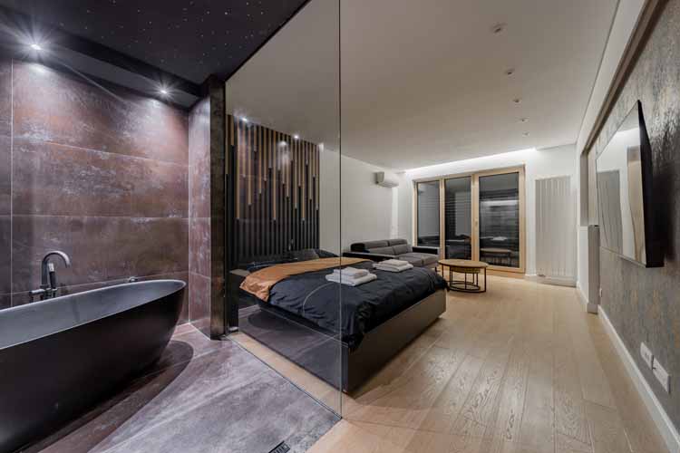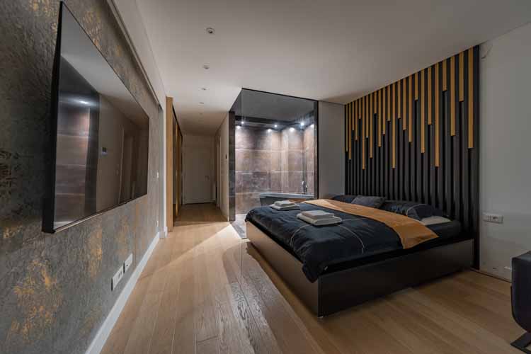 Apartman raspolaže velikim vodenim krevetom (850l) sa opcijom podešavanja temperature vode i ugaone garniture. U sklopu apartmana je sauna, luksuzna stilska kada. Ukoliko dolazite automobilom garažnom esto je uključeno u cenu.