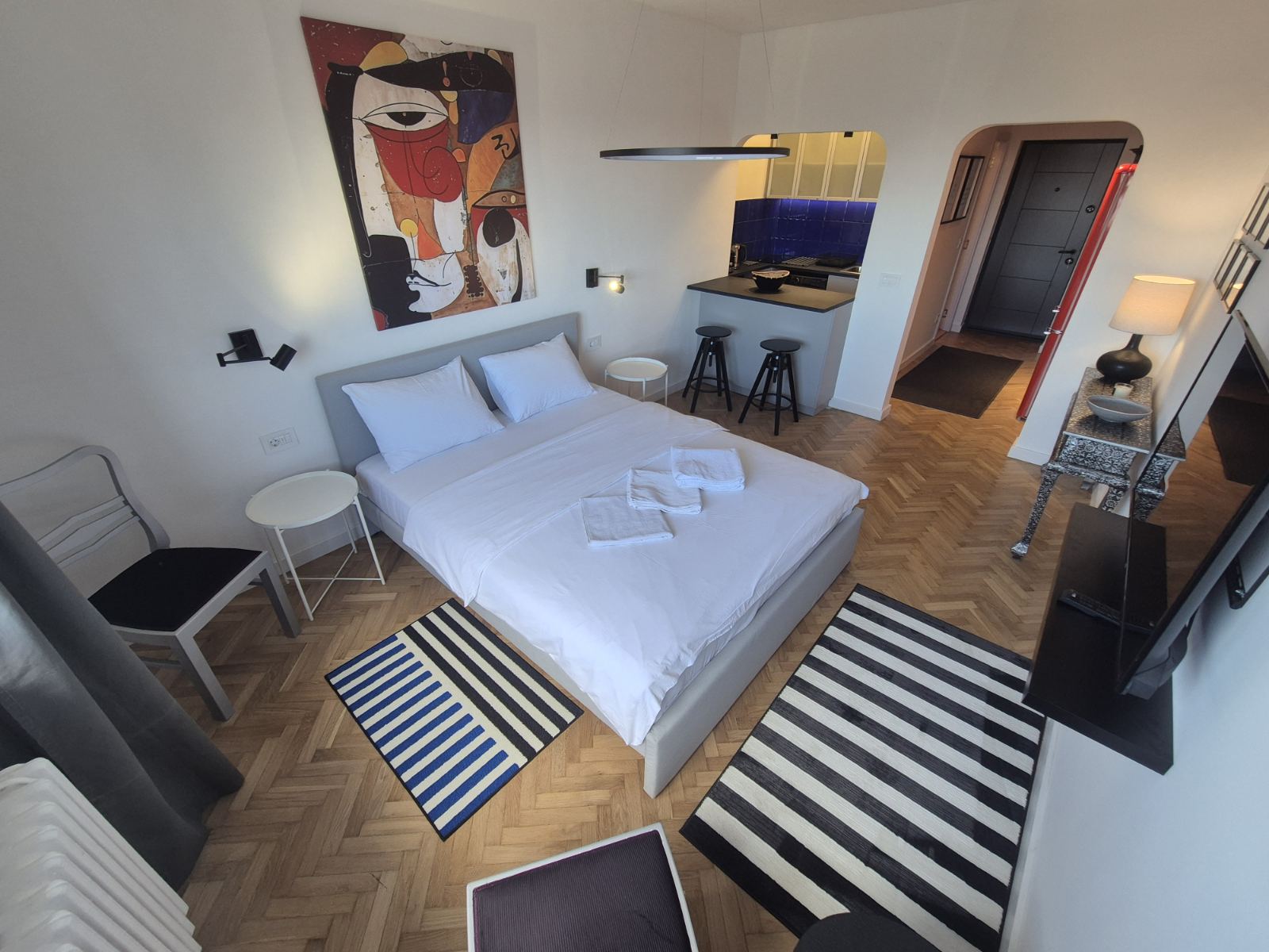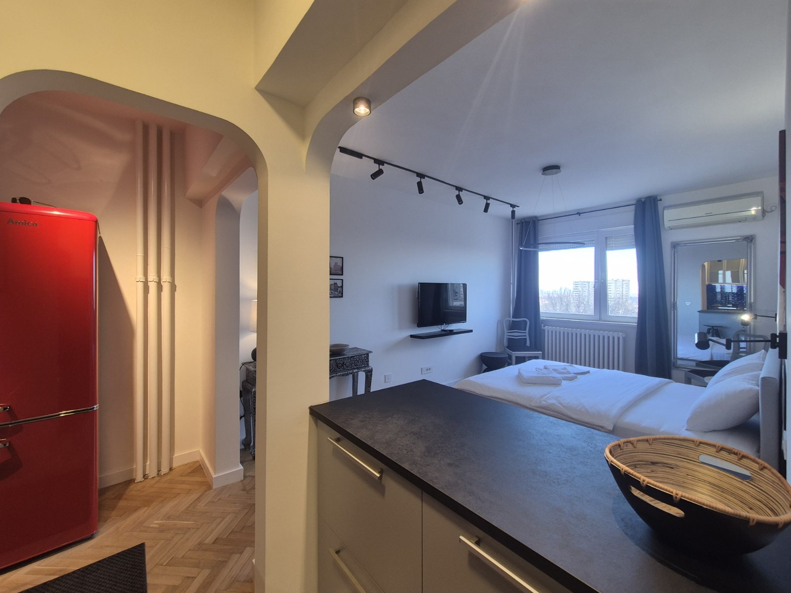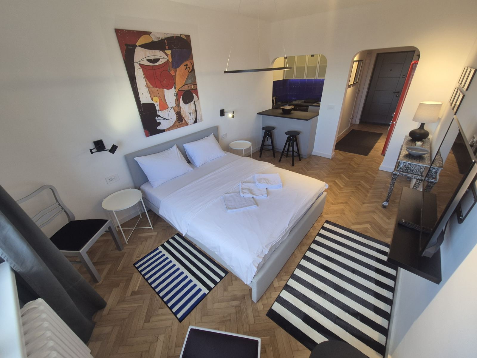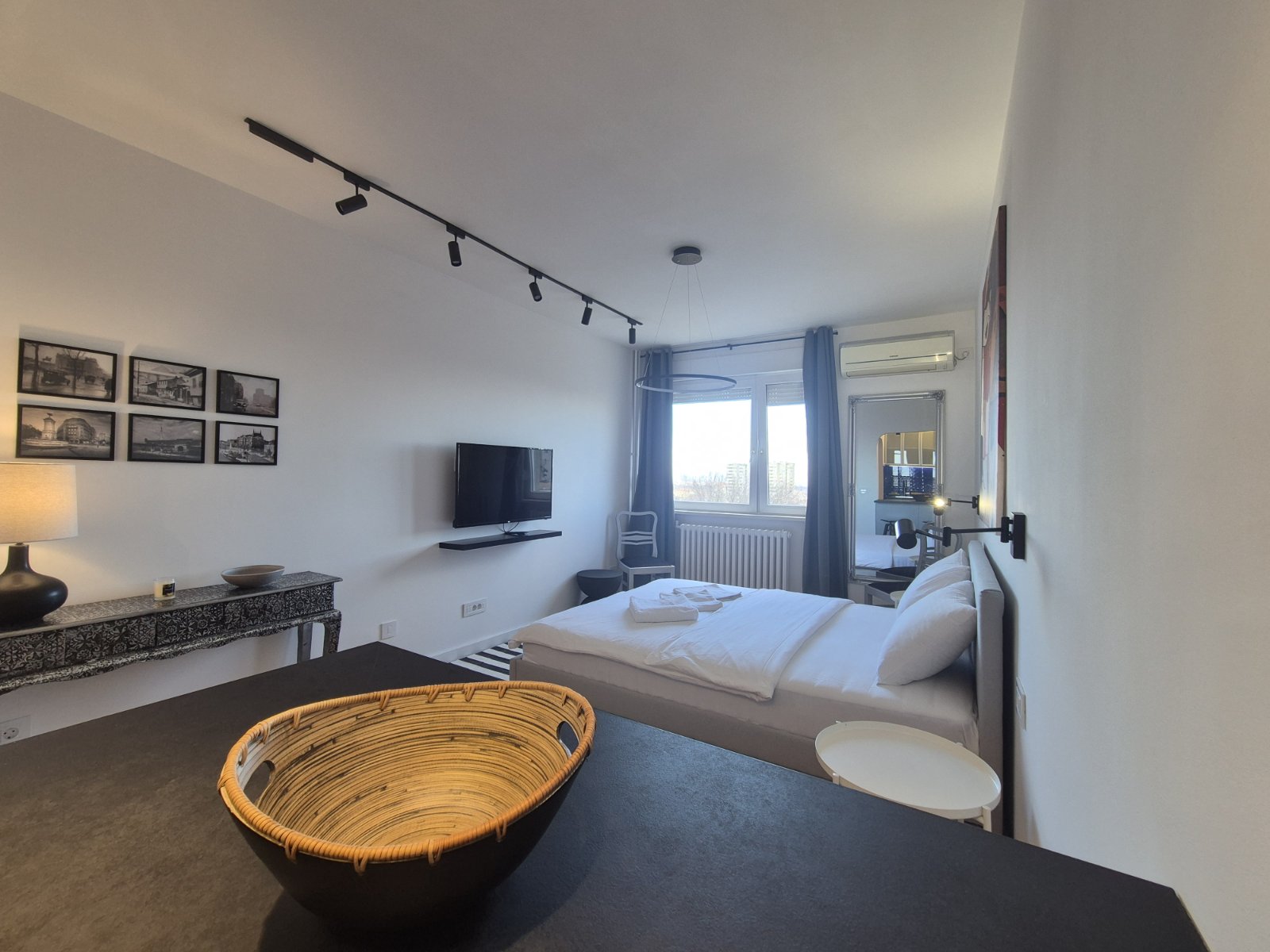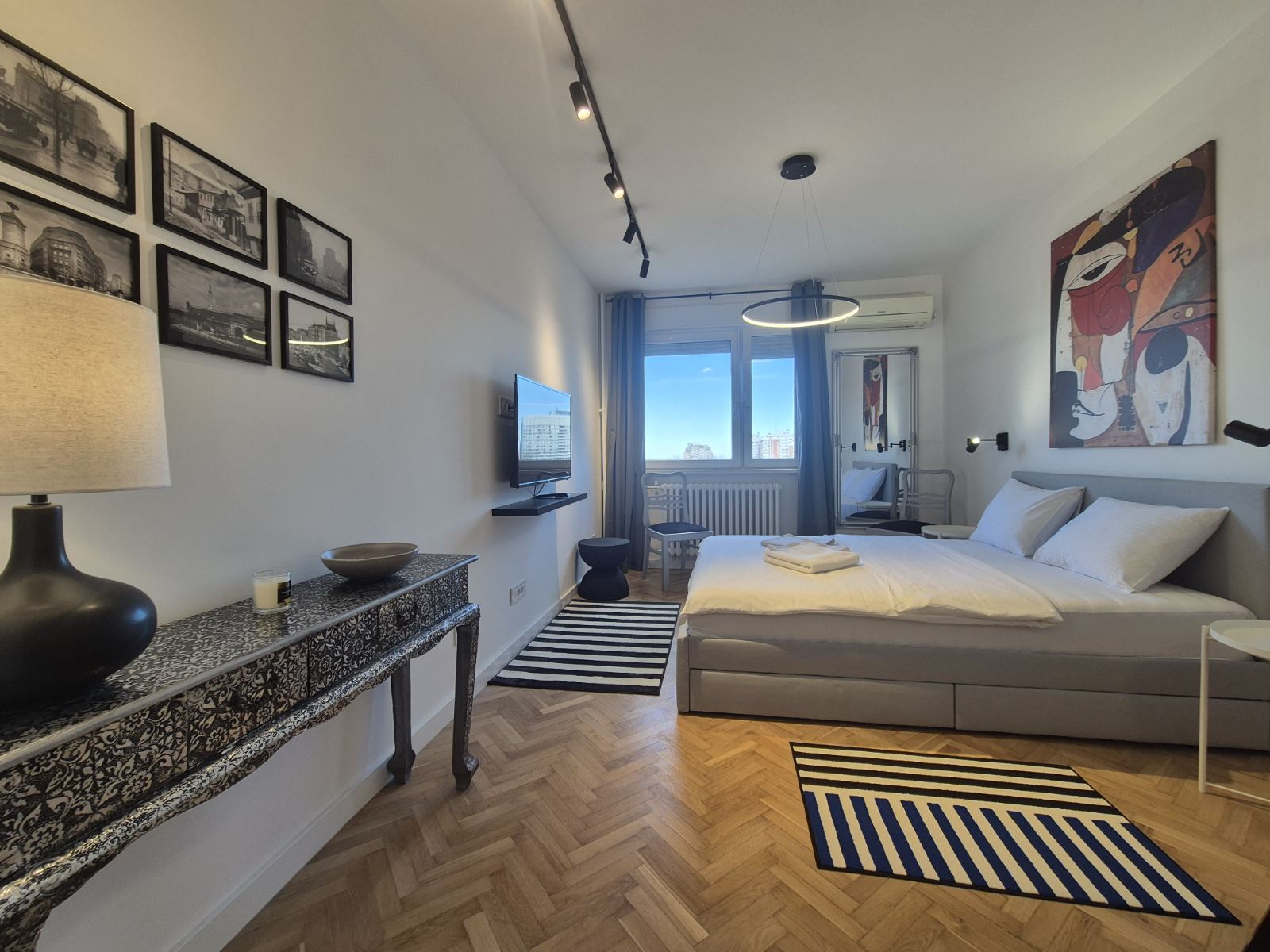Studio Madera 2 je moderno opremljen stan gde interesantna i kontrastna igra boja daje teksturu i dubinu perfektno osmišljenom prostoru. Vrlo funkcionalan studio za svaku preporuku, kako lokacijski tako i po lepoti.