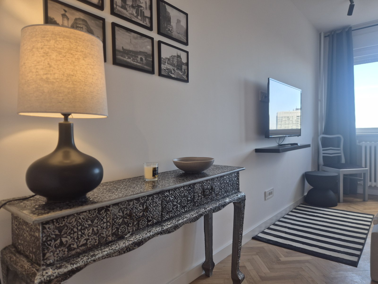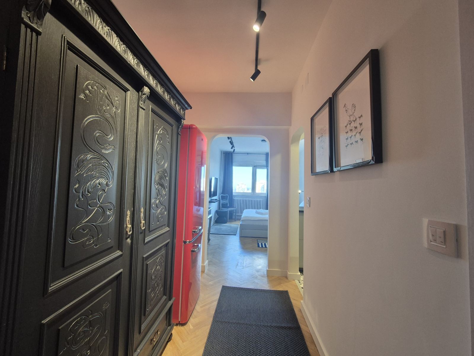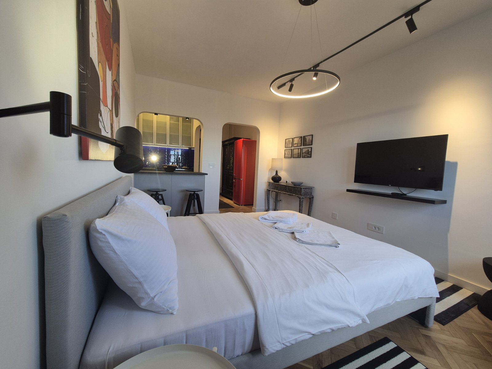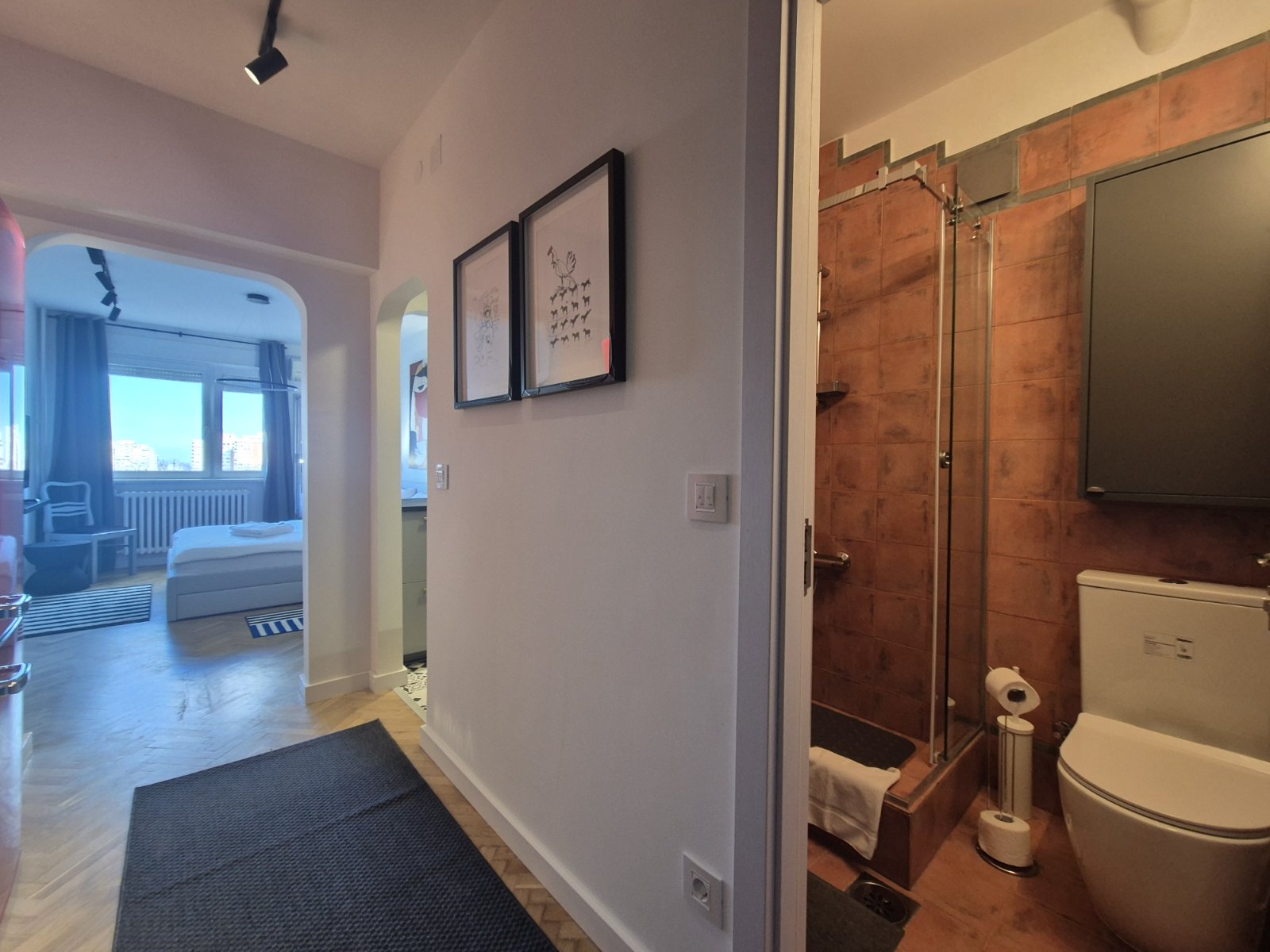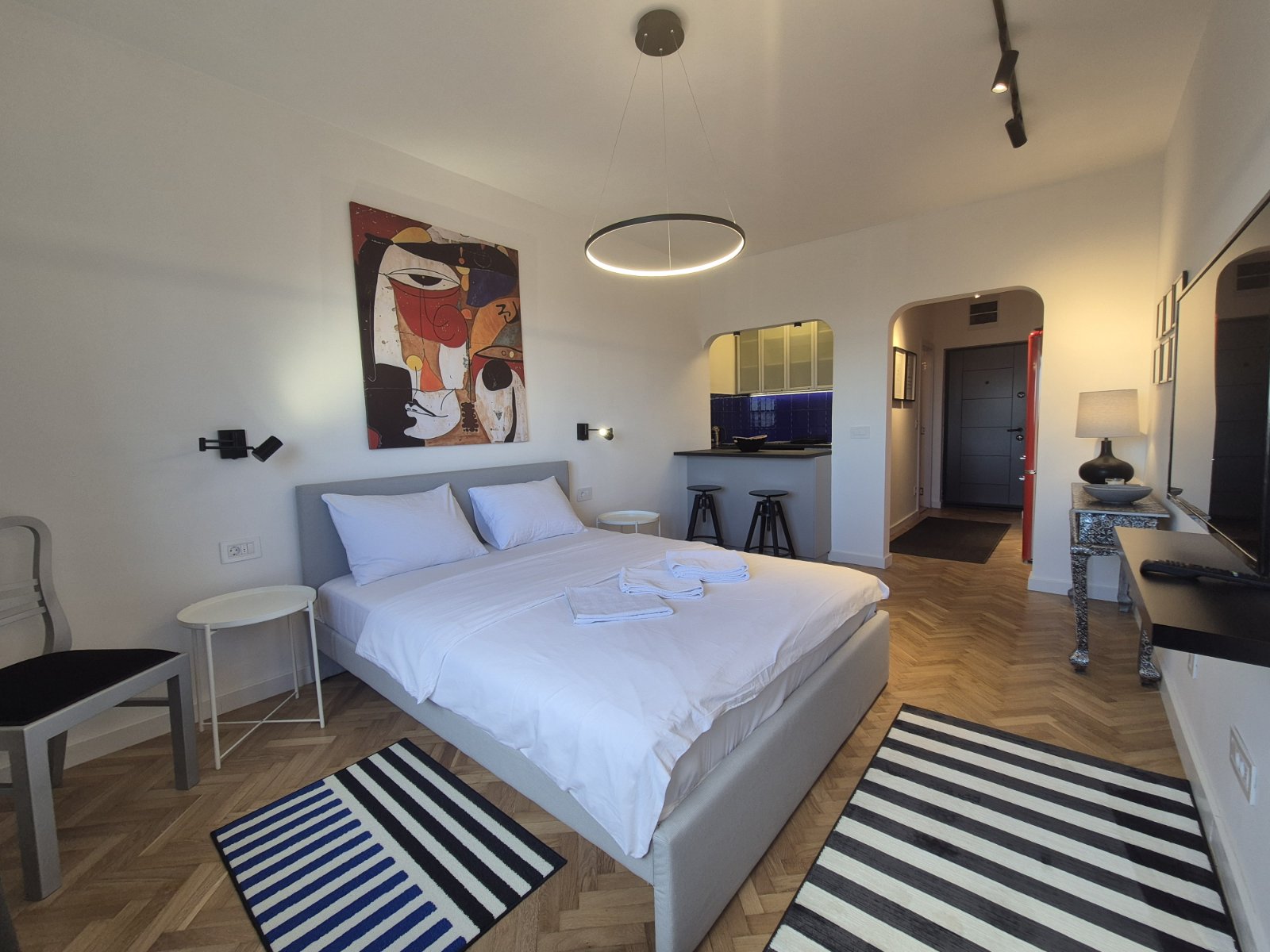 Studio Madera 2 je moderno opremljen stan gde interesantna i kontrastna igra boja daje teksturu i dubinu perfektno osmišljenom prostoru. Vrlo funkcionalan studio za svaku preporuku, kako lokacijski tako i po lepoti.